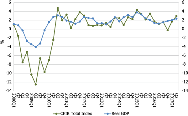 Figure 2: Quarterly CEIR Total Index for the Overall Exhibition Industry Vs. Quarterly Real GDP, Year-over-Year Growth, 2008Q1-2017Q2