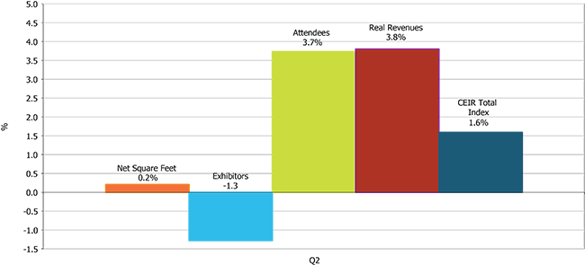 第二季度,除参展商外,所有展览指标均同比上涨(图 3 和图 4)。实际收入(经通胀调整后的名义收入)和参观人数分别增长 3.8% 和 3.7%,增幅最大。净平方英尺 (NSF) 温和上涨 0.2%,参展商则下跌 1.3%。